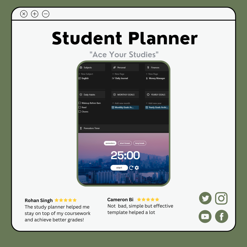 This Notion template is designed specifically for students who want to take control of their studies and achieve their academic goals. With the "Ace Your Studies" template, you can plan your week, access your calendar, and organize everything in one spot. The template includes a powerful note-taking system, an assignment tracker, and a stress-reducing section. To help you stay focused and productive, it also includes a Pomodoro clock and a daily habits tracker. And to keep you motivated, there's a section for setting and tracking your academic goals. With the "Ace Your Studies" template, you'll have all the tools you need to stay organized, reduce stress, and achieve your academic dreams. Whether you're a high school student, college student, or beyond, this template is the ultimate solution for staying on top of your studies. Get started today and watch your grades soar!